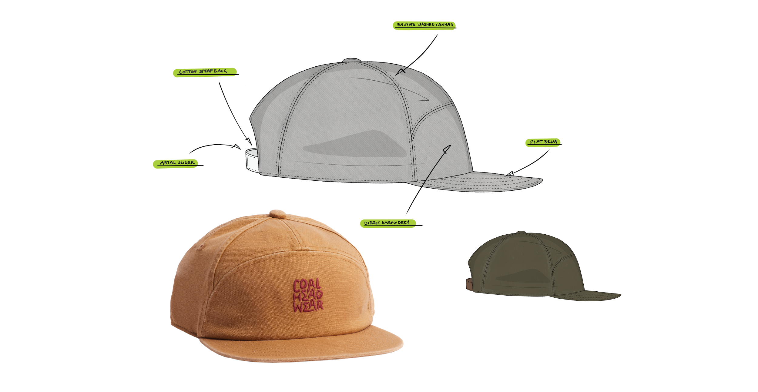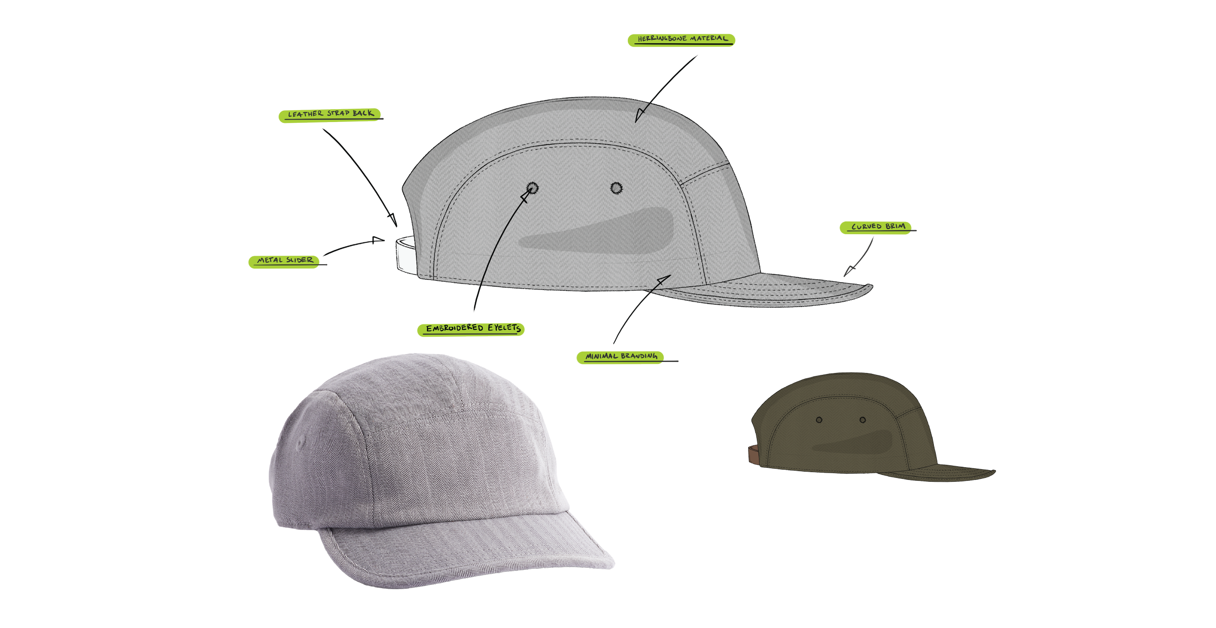 With a quest to find a balance of modern/technical and heritage/handmade, this season introduced some a variety of materials including air meshes, updated recycled materials, organic cottons and enzyme washed finishings. The silhouettes include a range from technical 5-panel trucker mid-crown cap to a 7-panel weathered cotton low-profile camper.