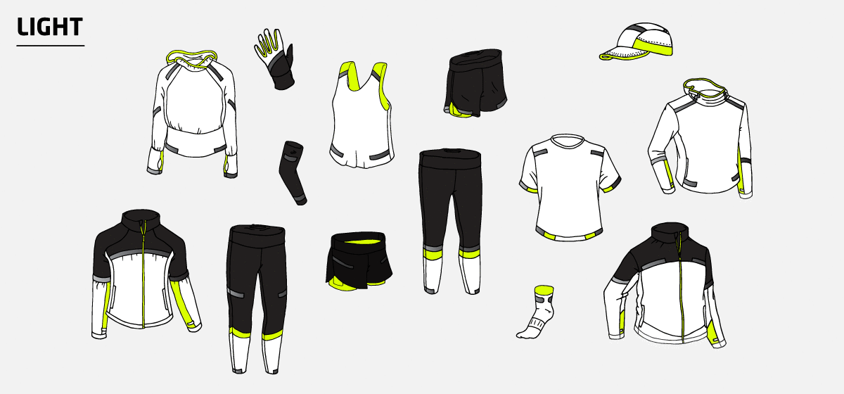 Men's and women's night running gear is made with reflective fabric strips and patches in strategic locations. These targeted areas catch the light of oncoming traffic or street lamps, reflecting brightly so people can see there's a runner on the road or path.